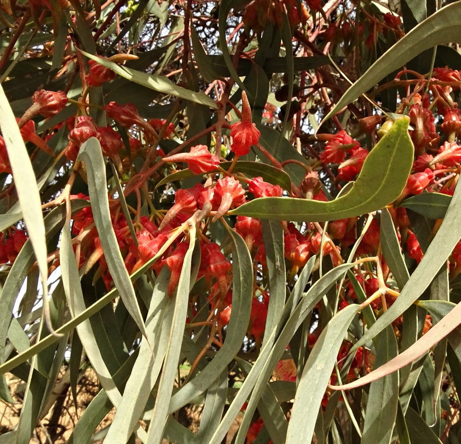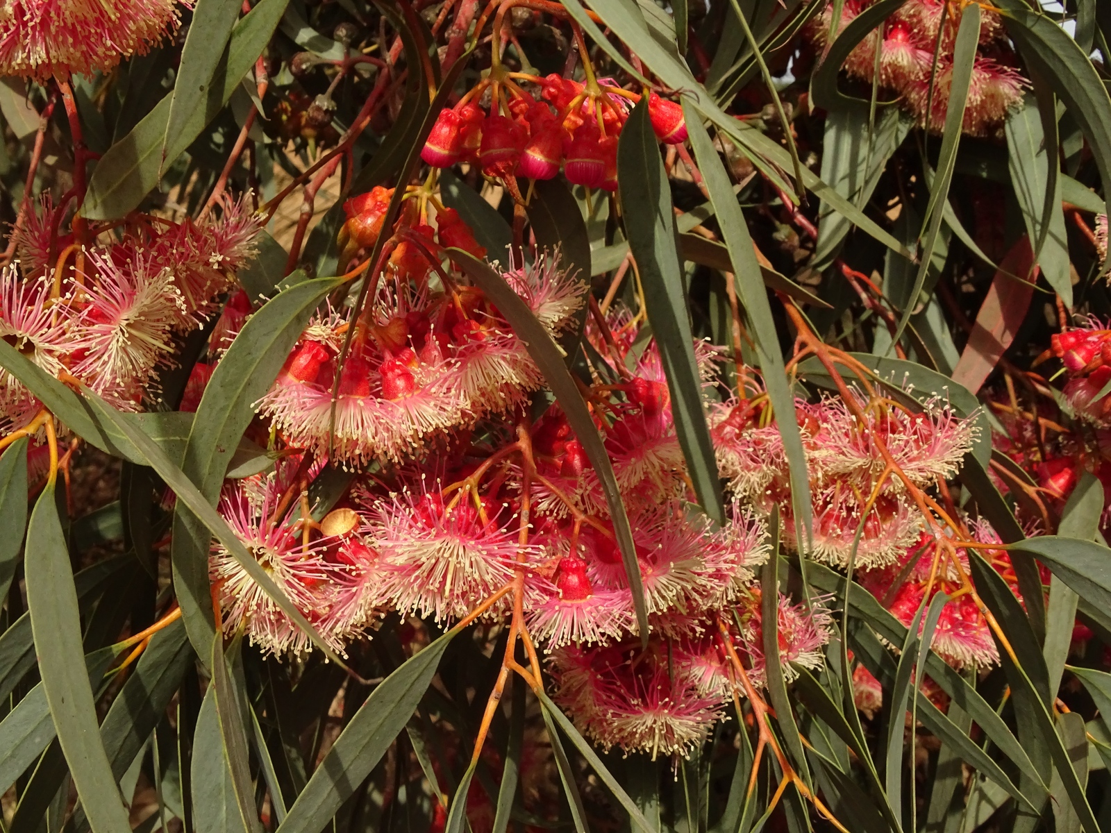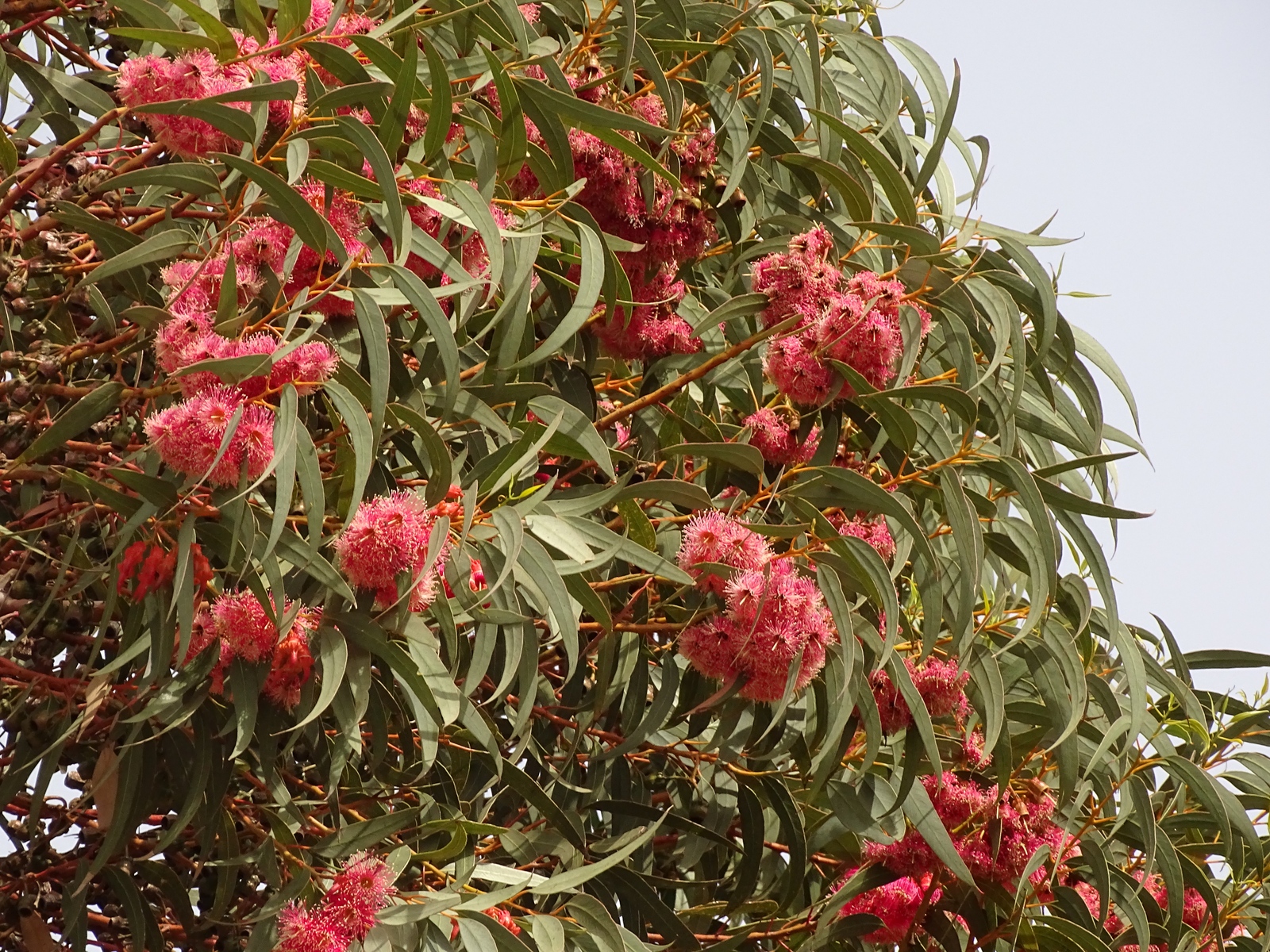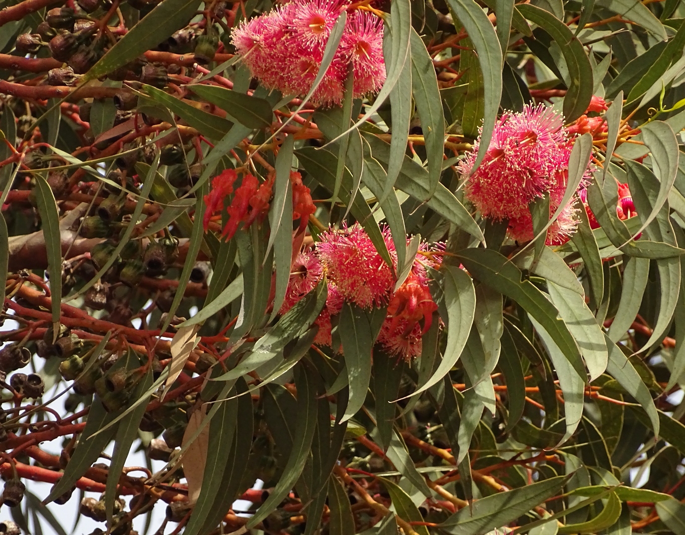 nieduże drzewo (F), do 10(13) m wys., rozgałęzione, o szerokiej koronie, kora szaro-czarna z jaśniejszymi plamami, spękana, liście szarozielone, lancetowate, do 12 cm dł. i 2 cm szer., kwiatostany złożone z 3-7 kwiatów, wyrastają z kątów liści, kwiaty koralowo różowe, rzadziej białe lub kremowe, pączki z charakterystycznym długim rożkiem na szczycie, VIII-XII, owocem cylindryczna torebka