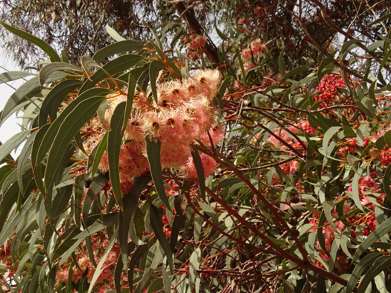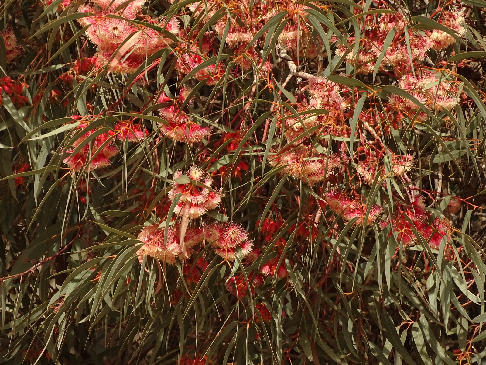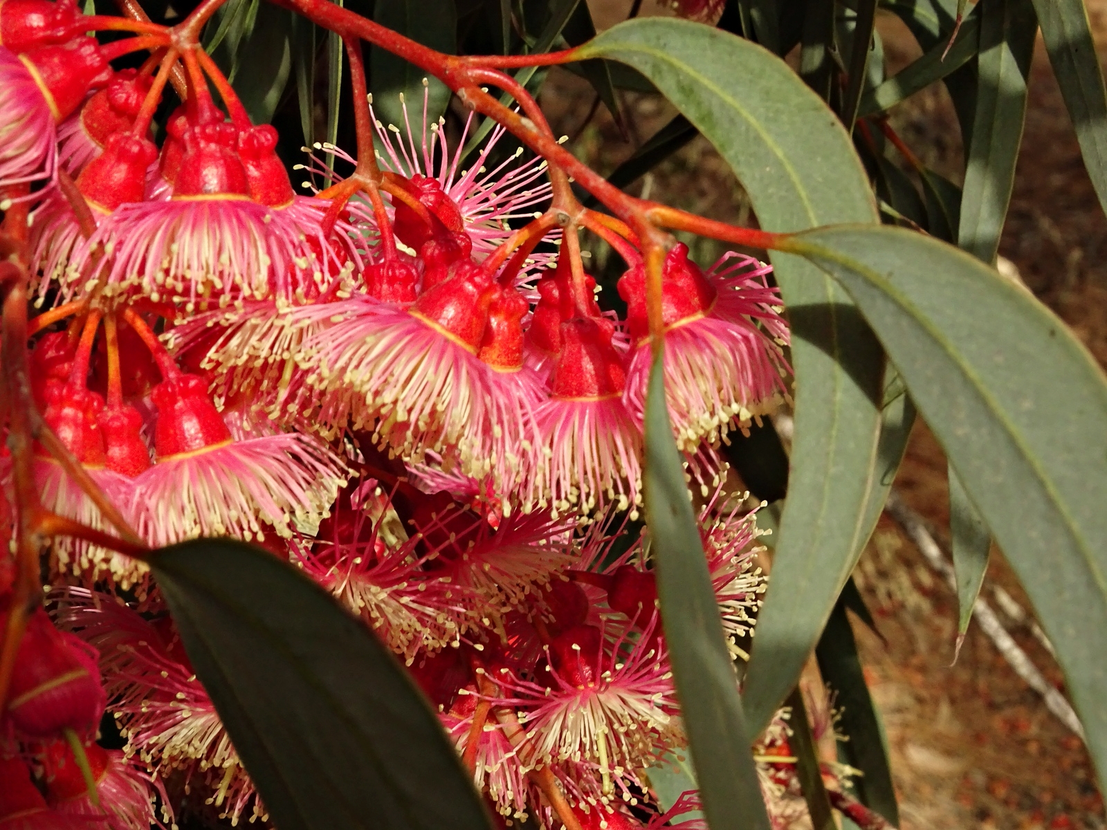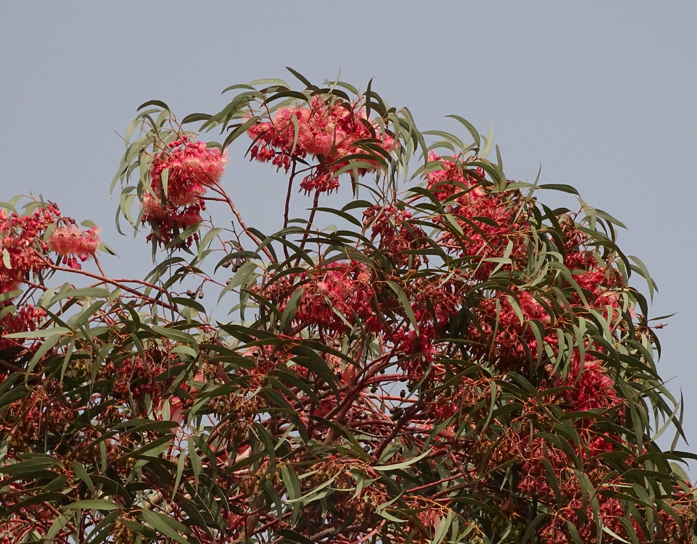 nieduże drzewo (F), do 10(13) m wys., rozgałęzione, o szerokiej koronie, kora szaro-czarna z jaśniejszymi plamami, spękana, liście szarozielone, lancetowate, do 12 cm dł. i 2 cm szer., kwiatostany złożone z 3-7 kwiatów, wyrastają z kątów liści, kwiaty koralowo różowe, rzadziej białe lub kremowe, pączki z charakterystycznym długim rożkiem na szczycie, VIII-XII, owocem cylindryczna torebka