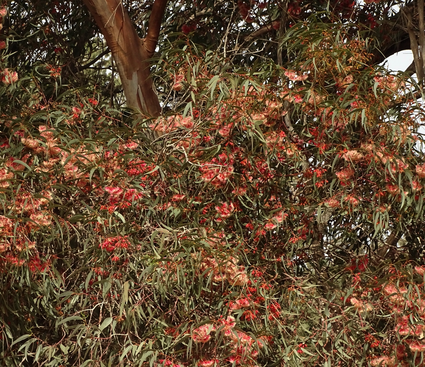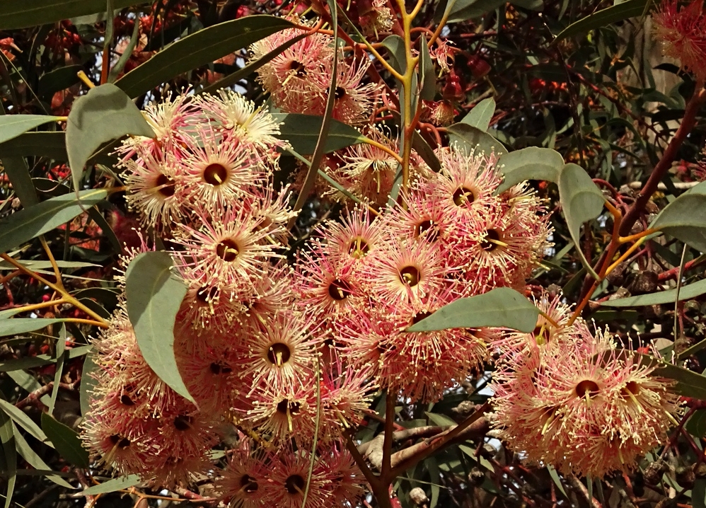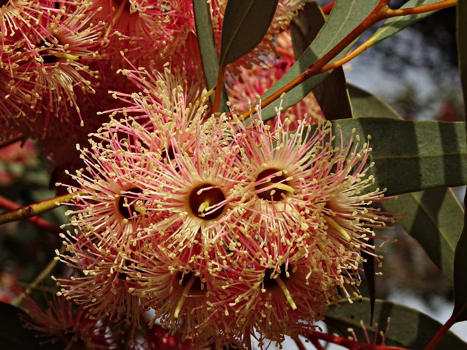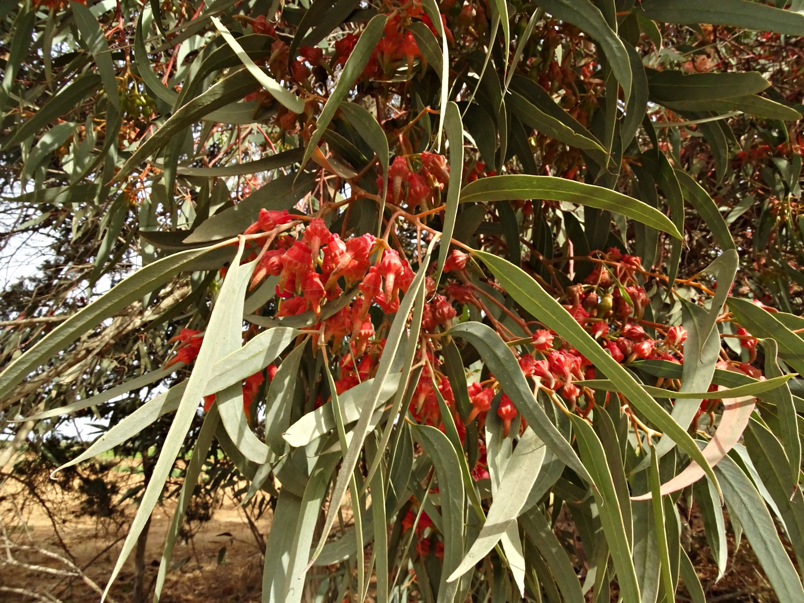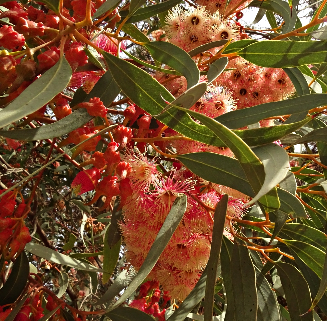 nieduże drzewo (F), do 10(13) m wys., rozgałęzione, o szerokiej koronie, kora szaro-czarna z jaśniejszymi plamami, spękana, liście szarozielone, lancetowate, do 12 cm dł. i 2 cm szer., kwiatostany złożone z 3-7 kwiatów, wyrastają z kątów liści, kwiaty koralowo różowe, rzadziej białe lub kremowe, pączki z charakterystycznym długim rożkiem na szczycie, VIII-XII, owocem cylindryczna torebka