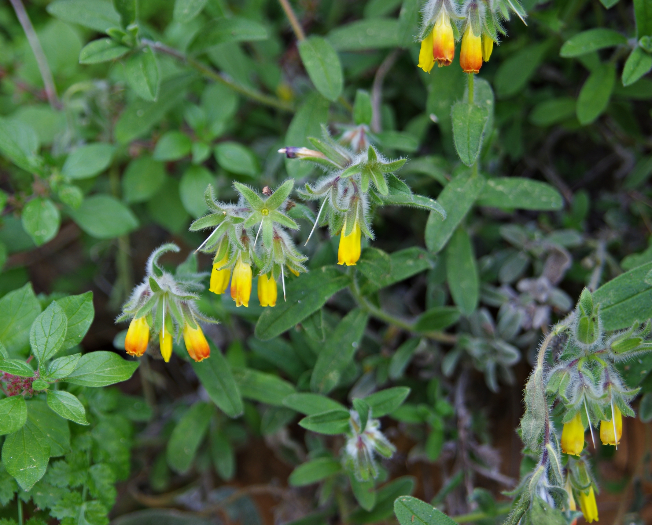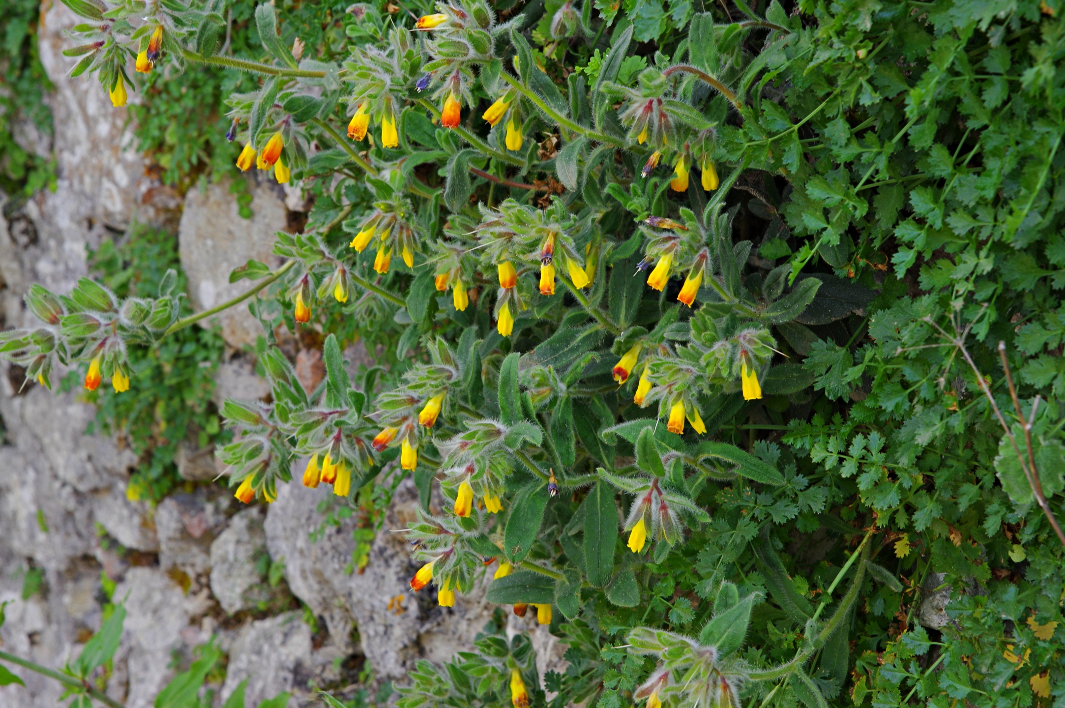 krótkotrwała bylina (H), do 40 cm wys., rozgałęziona od nasady, łodygi owłosione krótkimi włoskami prostymi i szczecinkami do 0.5 cm dł., liście w przyziemnej różyczce lancetowate, do 15 cm dł., łodygowe krótsze, podługowato-lancetowate, kwiaty do 1,5 cm dł., owłosione, jasnożółte za młodu, w miarę kwitnienia zmieniają kolor na pomarańczowo-brązowy, pręciki schowane w rurce korony, III-VI, owocem rozłupnia
