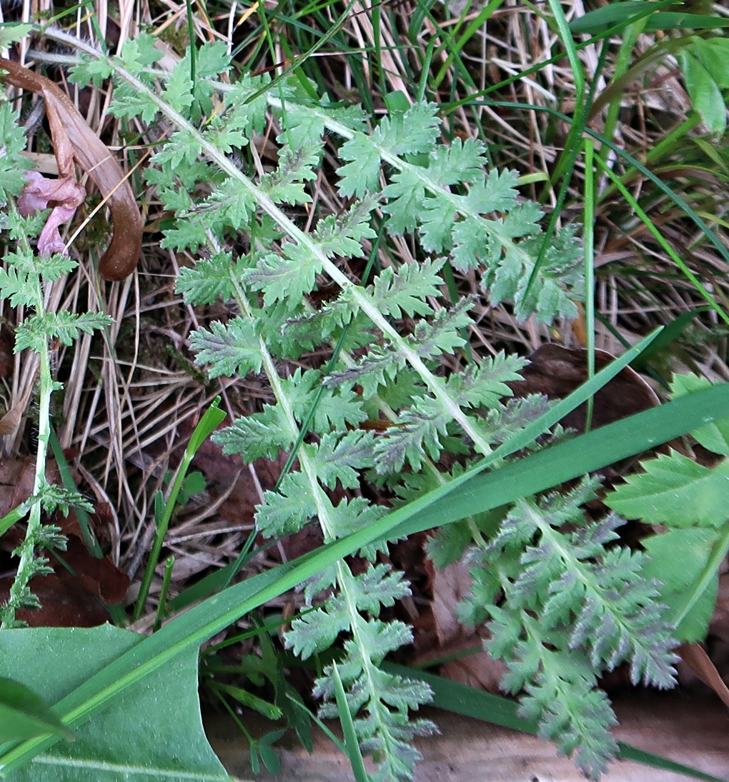 bylina (H), do 5 cm wys., łodygi brak, liście w przyziemnej różyczce, 2-krotnie pierzastosieczne, do 10 cm dł., ogonek owłosiony, kwiaty wyrastają na krótkich, owłosionych szypułkach z centrum różyczki liściowej, korona różowa, do 3,5 cm dł., dwuwargowa, warga dolna trójdzielna, V-VI, owocem kulista torebka