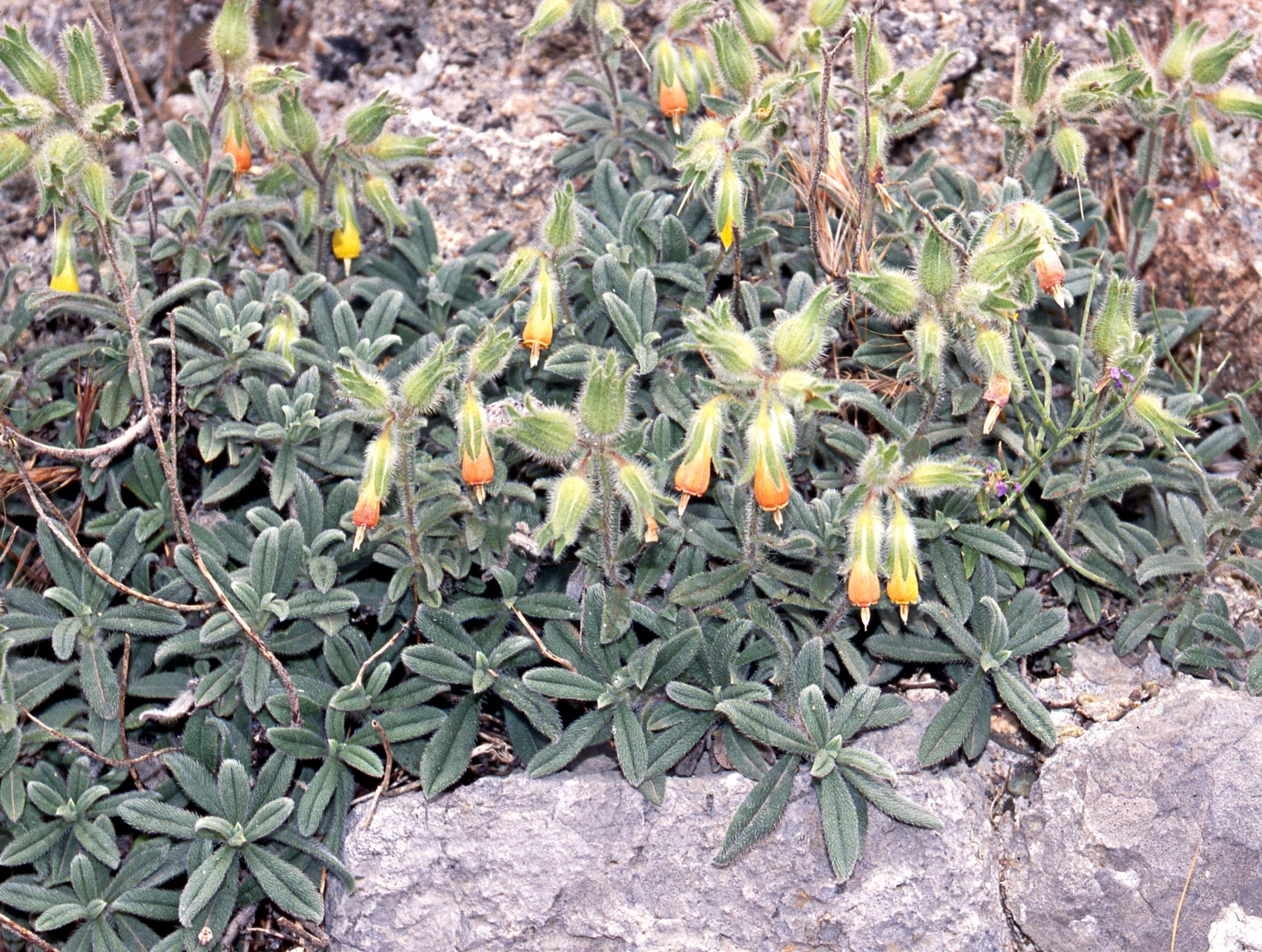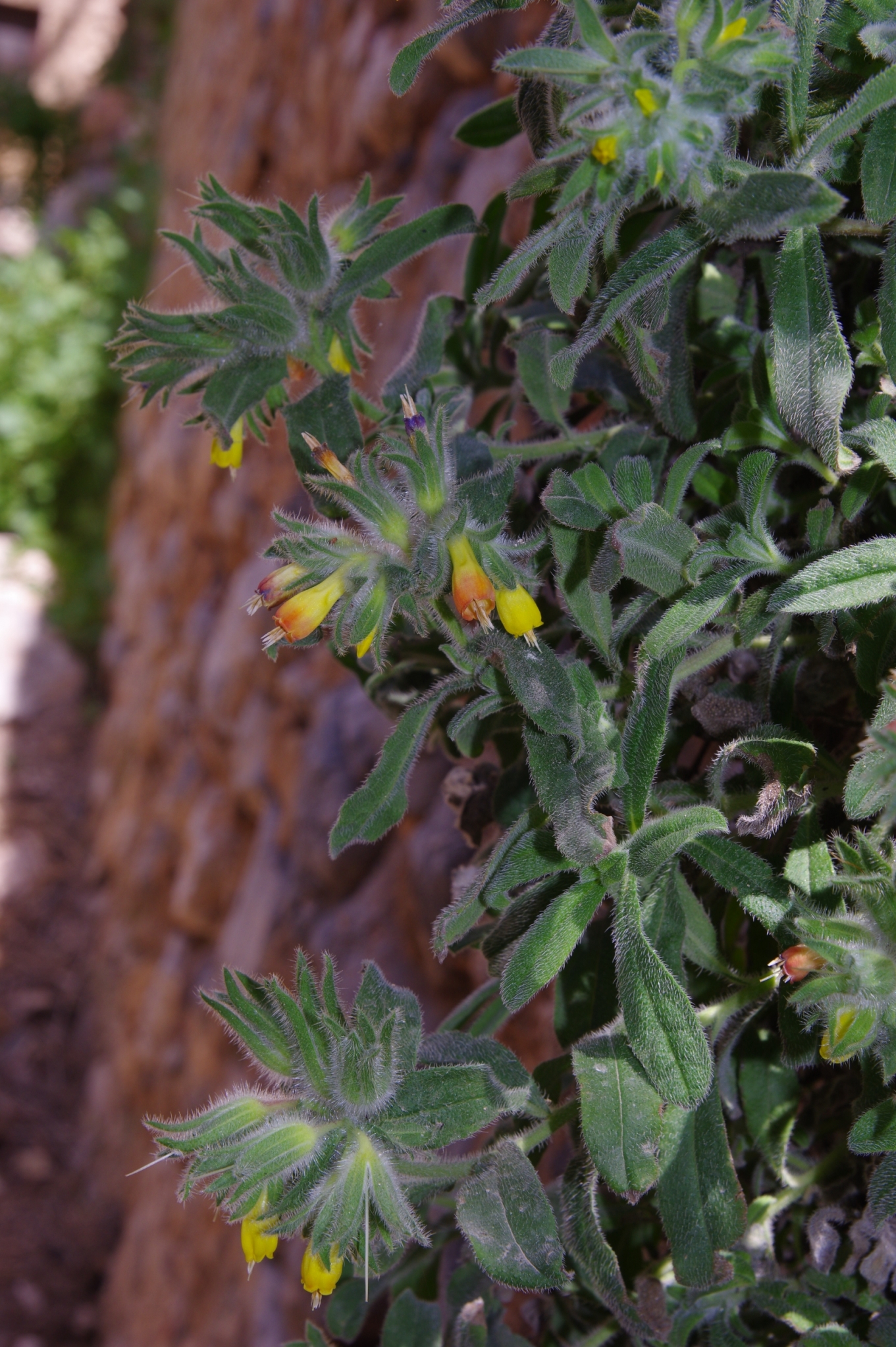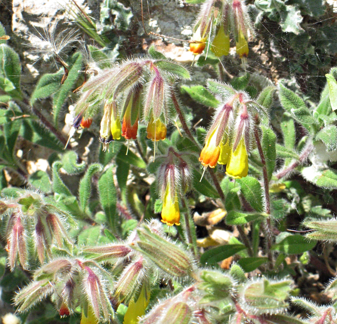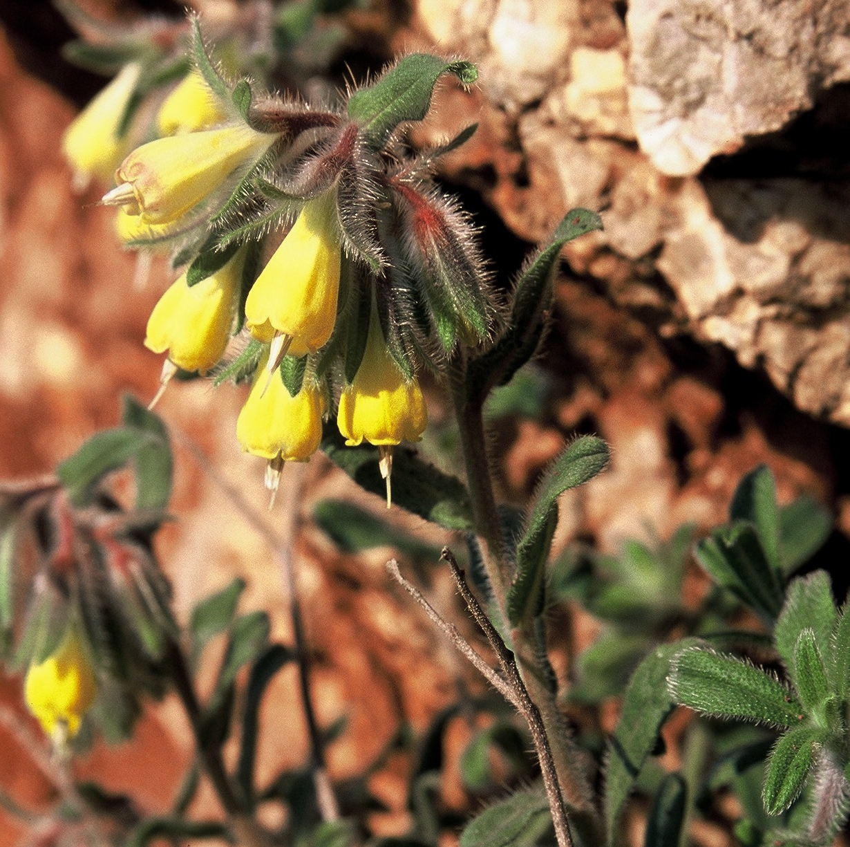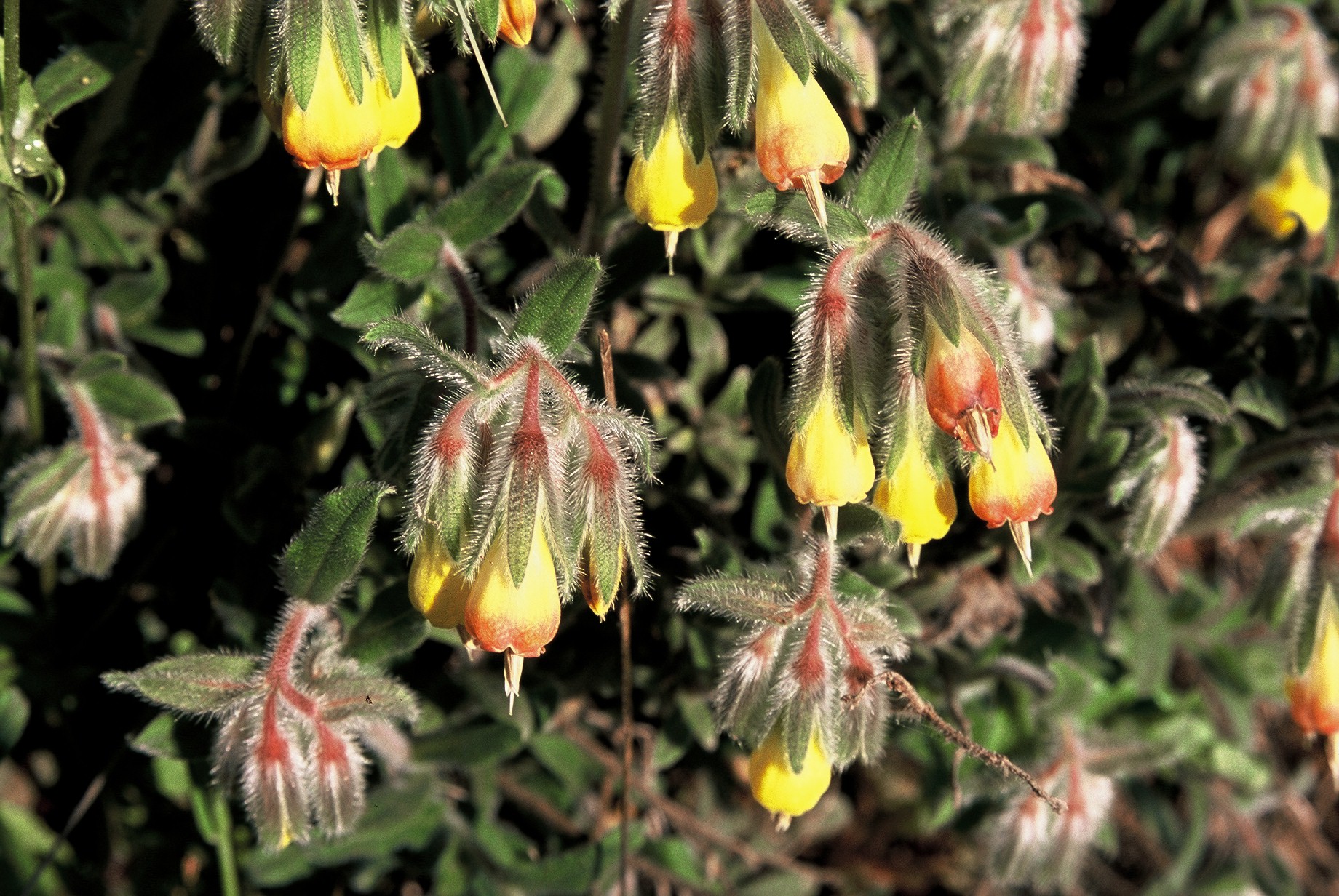półkrzew (Ch suff), do 40(80) cm wys., łodygi wzniesione, rozgałęzione od nasady, pokryte szczeciniastymi włoskami, bez włosów gwiazdkowatych, liście podłużne, lancetowate lub równowąskie, siedzące, dolne do 7 cm dł. i 1 cm szer., szarozielone, kwiatostan szczytowy, kwiaty zwisające, kielich szczeciniasty, korona żółta, na końcu czerwonawa, w miarę kwitnienia przechodząca w czerwonobrązową, do 2 cm dł, dłuższa od kielicha, pręciki wystające z korony, III-V, owocem rozłupnia