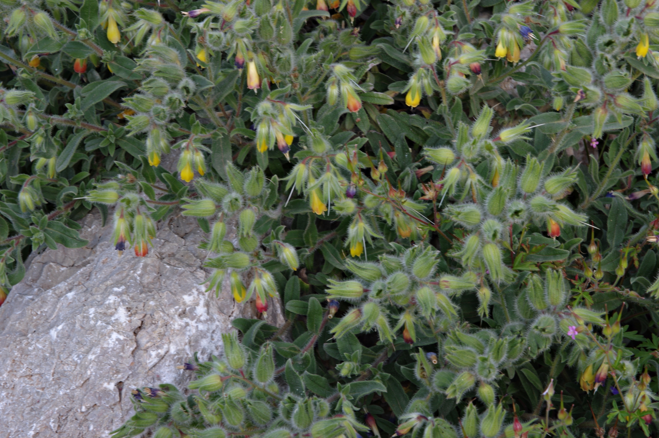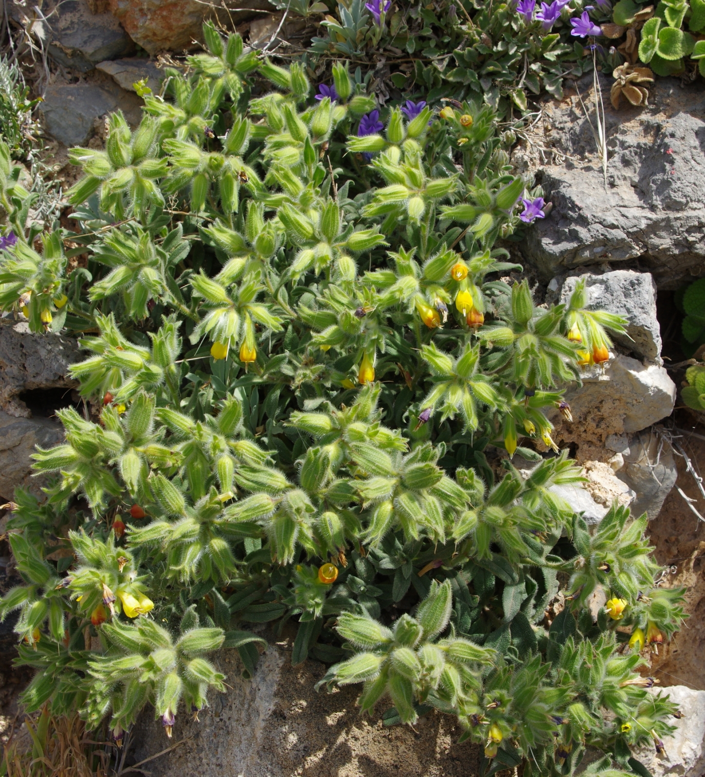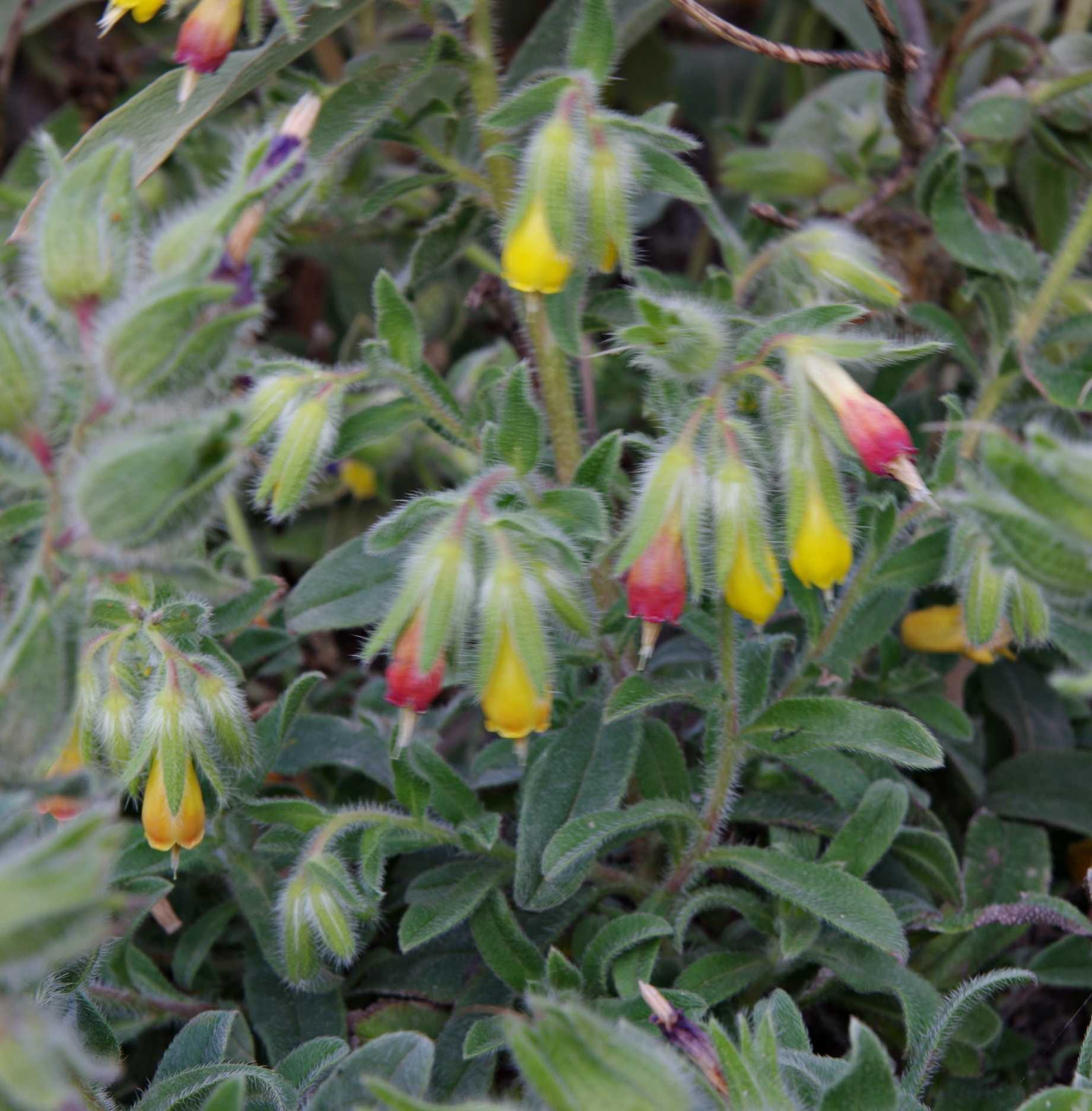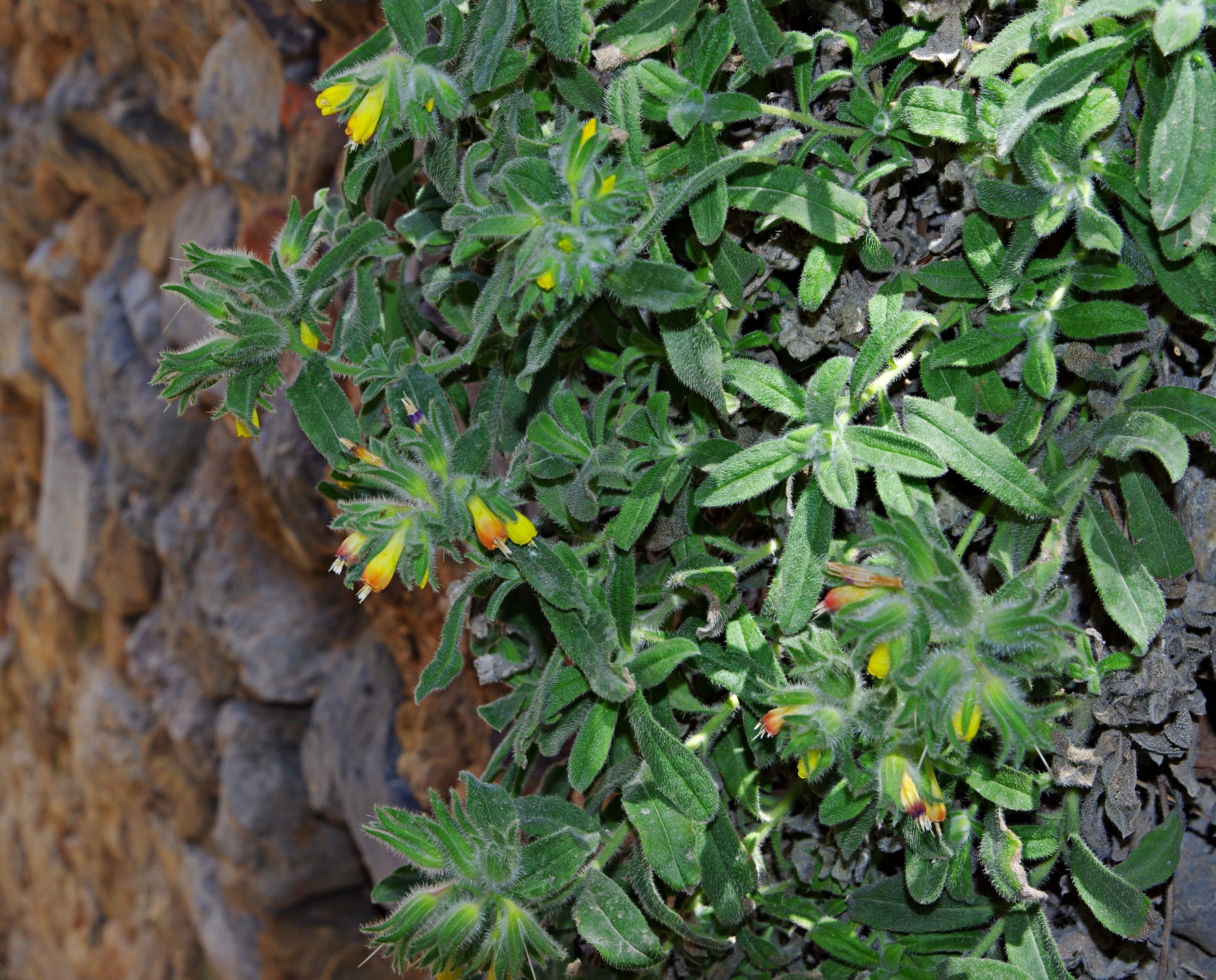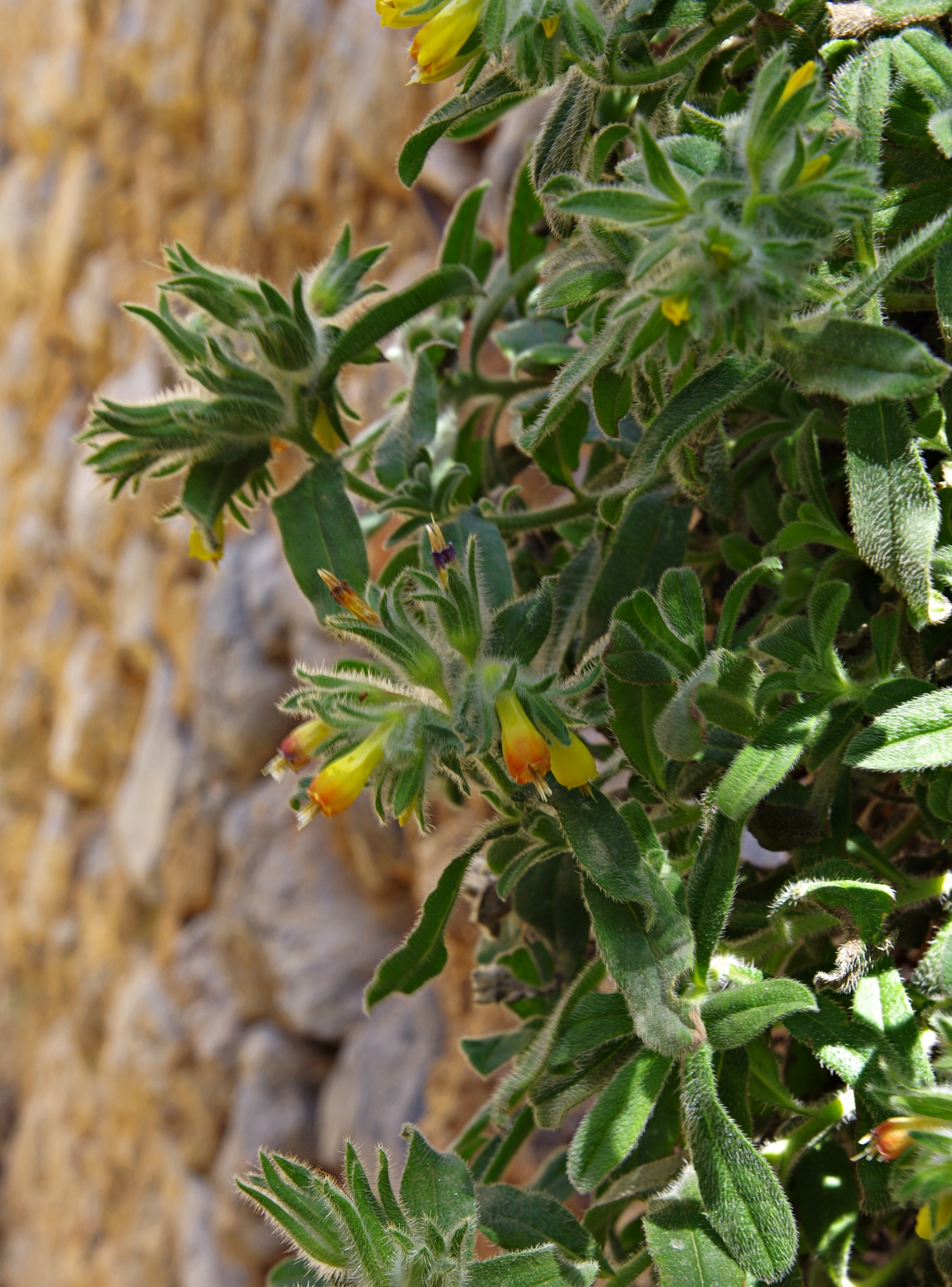 półkrzew (Ch suff), do 40(80) cm wys., łodygi wzniesione, rozgałęzione od nasady, pokryte szczeciniastymi włoskami, bez włosów gwiazdkowatych, liście podłużne, lancetowate lub równowąskie, siedzące, dolne do 7 cm dł. i 1 cm szer., szarozielone, kwiatostan szczytowy, kwiaty zwisające, kielich szczeciniasty, korona żółta, na końcu czerwonawa, w miarę kwitnienia przechodząca w czerwonobrązową, do 2 cm dł, dłuższa od kielicha, pręciki wystające z korony, III-V, owocem rozłupnia