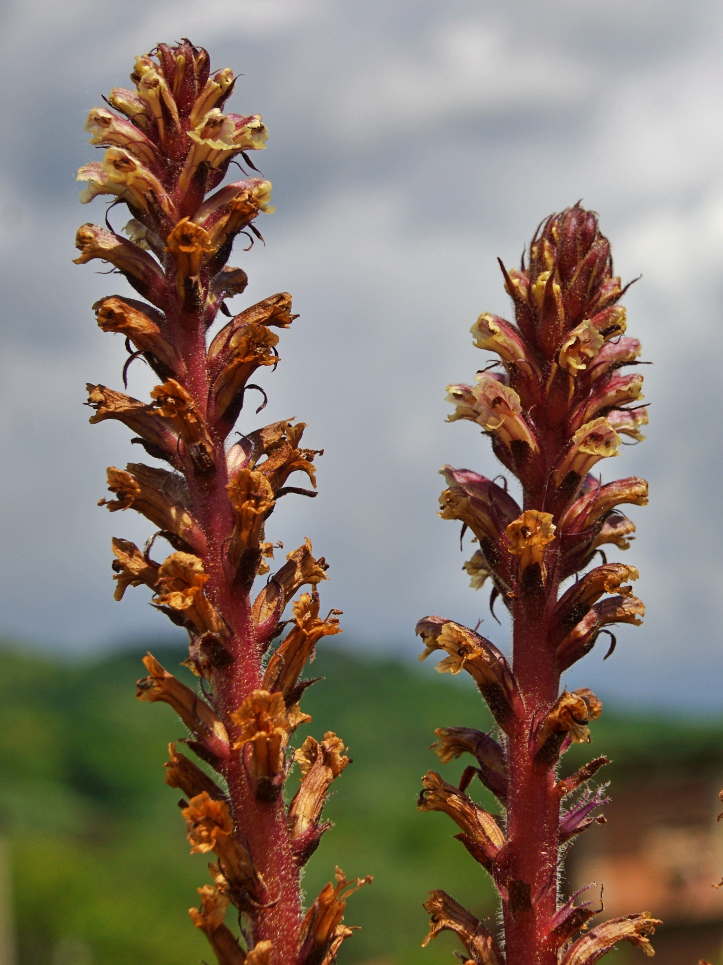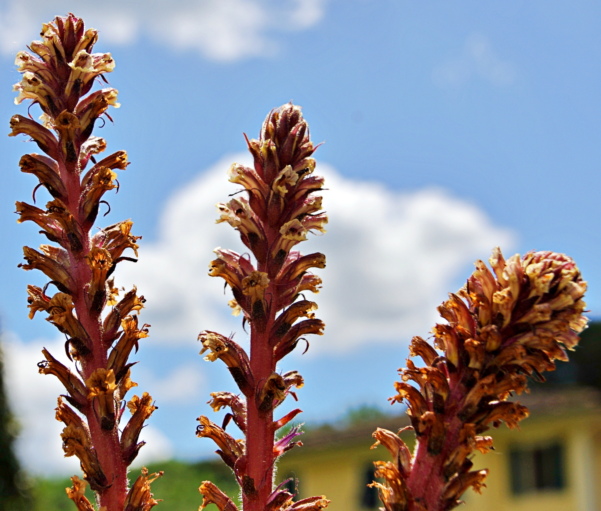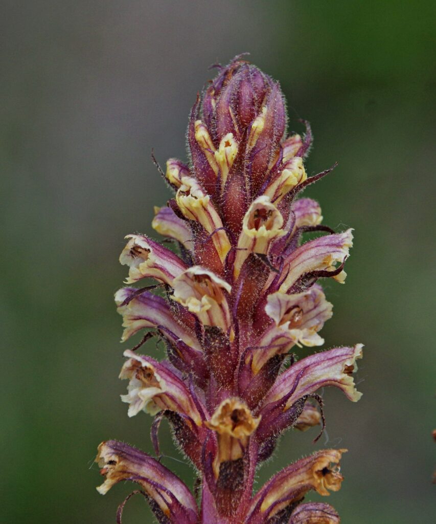 roślina jednoroczna (T), do 60 cm wys., łodyga prosta, mięsista, czerwonobrązowa, liście łuskowate, kwiaty w gęstym kwiatostanie, rurkowate, wygięte łukowato, do 2 cm dł., białe z czerwonym żyłkowaniem, czasem na grzbiecie fioletowo nabiegłe, znamię słupka żółte V-VI, owocem torebka
