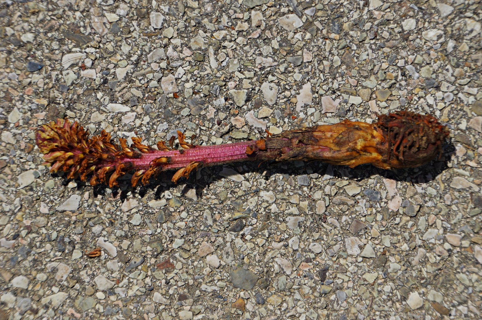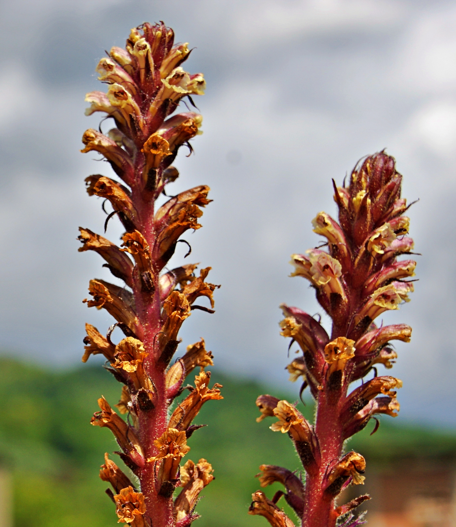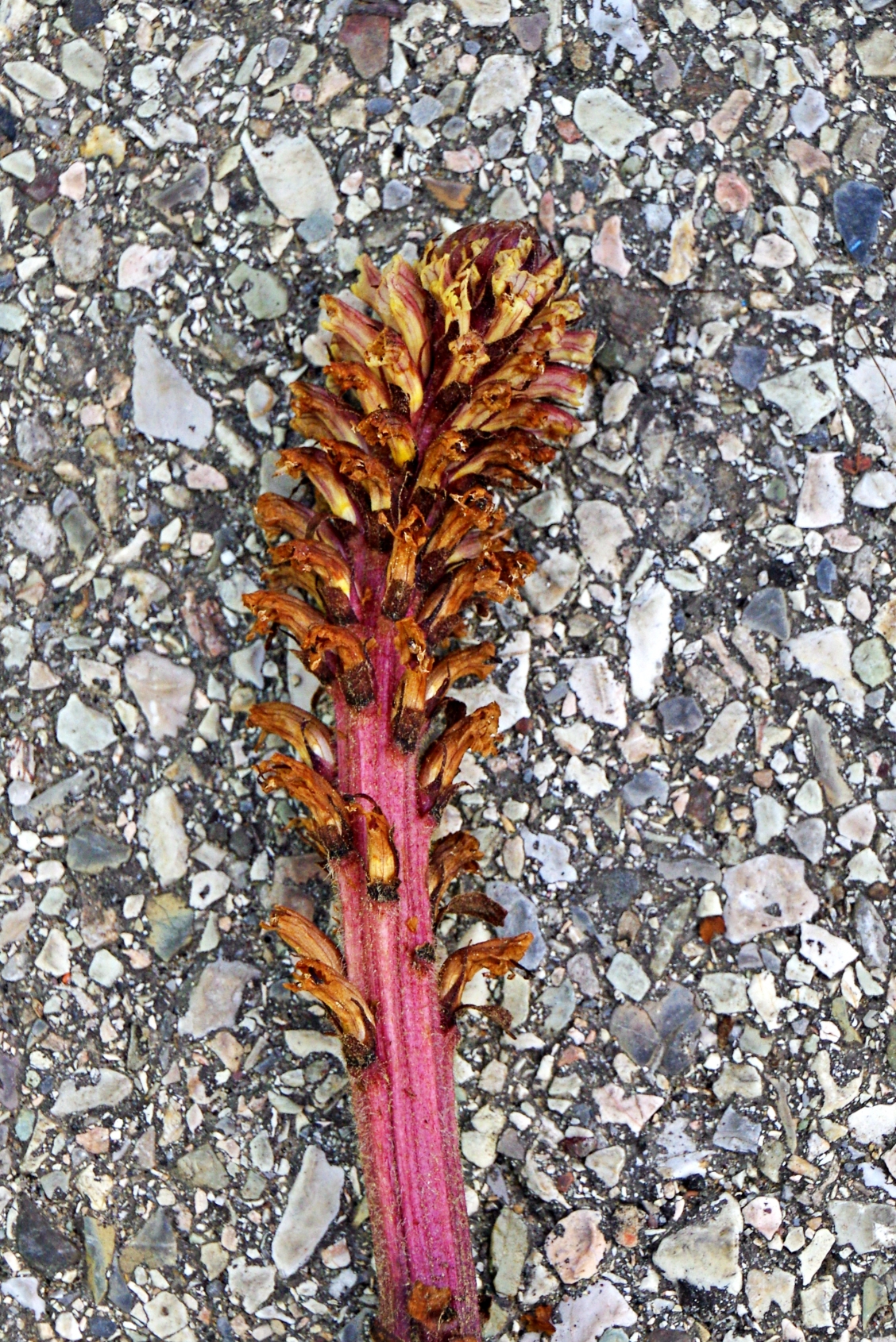 roślina jednoroczna (T), do 60 cm wys., łodyga prosta, mięsista, czerwonobrązowa, liście łuskowate, kwiaty w gęstym kwiatostanie, rurkowate, wygięte łukowato, do 2 cm dł., białe z czerwonym żyłkowaniem, czasem na grzbiecie fioletowo nabiegłe, znamię słupka żółte V-VI, owocem torebka